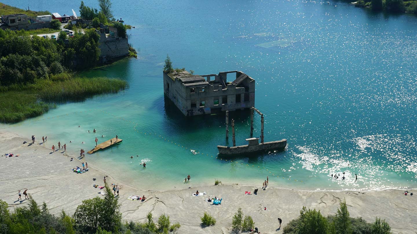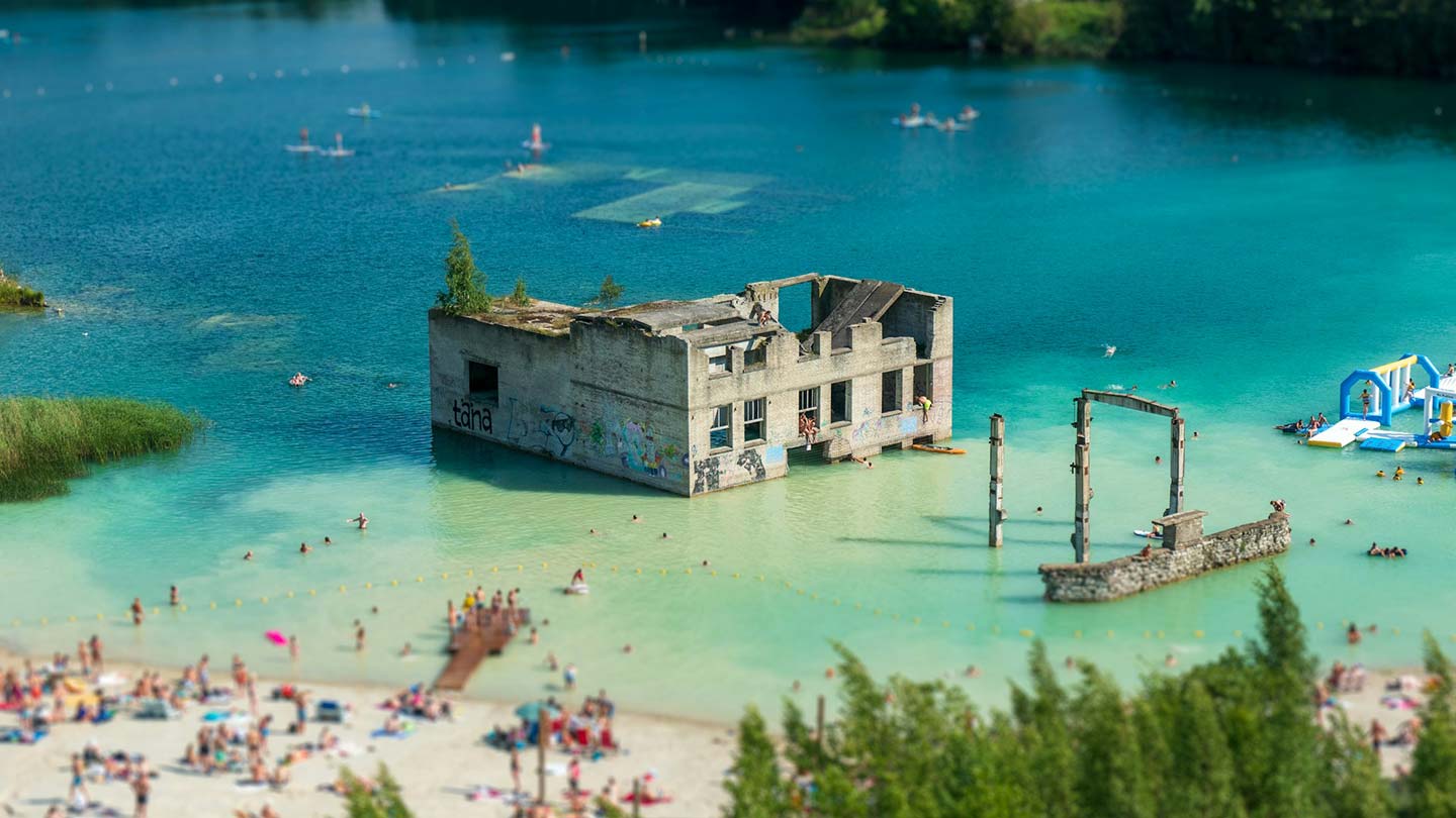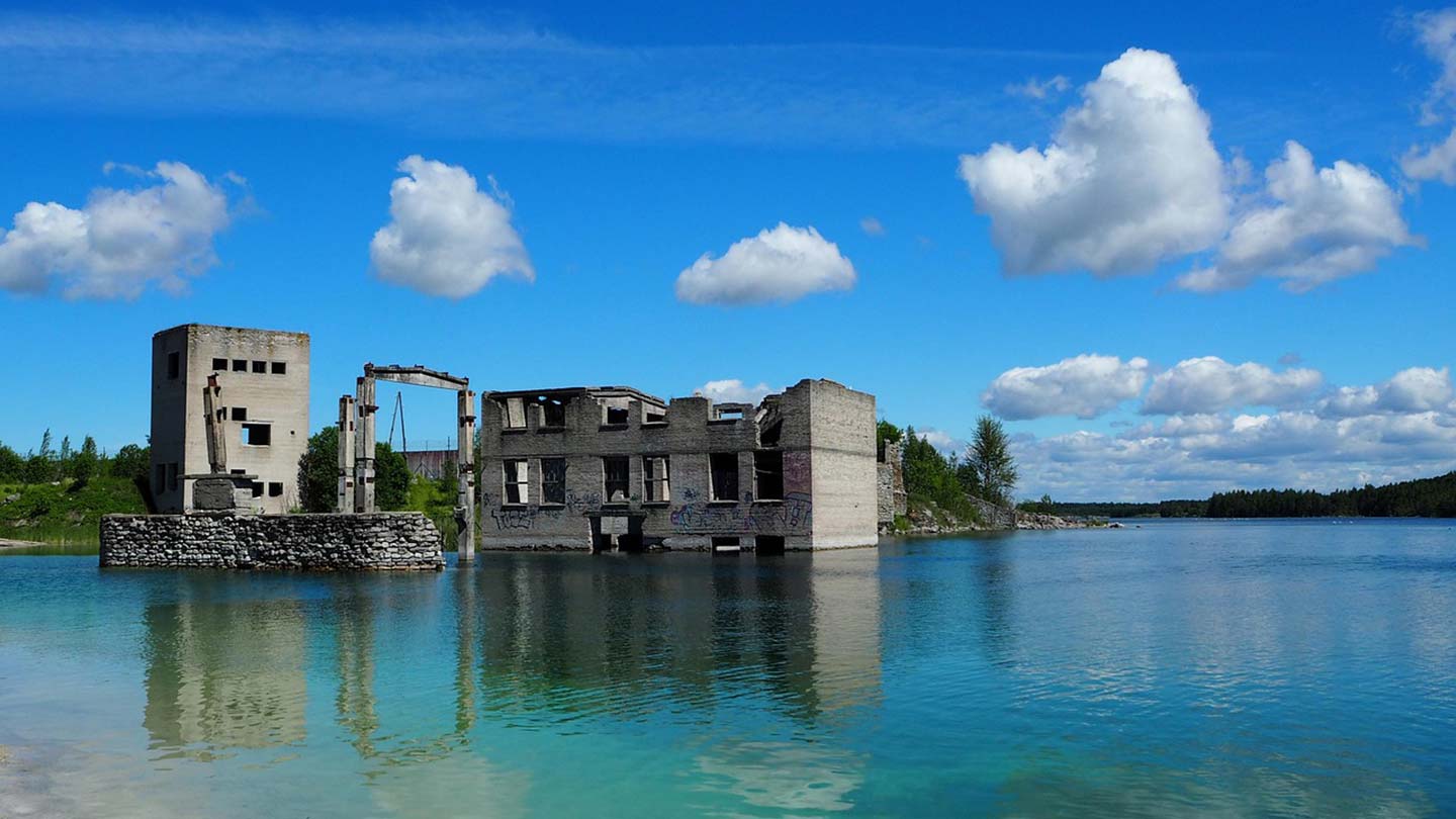 Ett övergivet, gammalt sovjetiskt fängelse vid Rummu stenbrott, omgiven av turkost vatten.