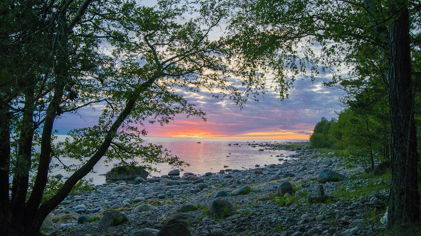 Vacker solnedgång vid Pärispea, Estland, med stenar och träd i förgrunden.