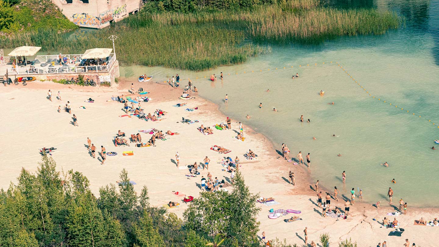 Strandhäng i Rummu, Estland, med människor som solbathing och badar.